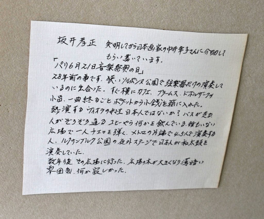 このすばらしい絵は、坂井孝正氏(89才、東ときわ台)が描かれたものです。説明文にありますように、定年まで教師をされていました。絵が好きで、現役中もパリに良く行かれていました。定年後目を悪くされ、現在は目が見えません。この絵は、画家の中井幸子さんの介添えで書かれたものです。長年絵を書かれていたので、体が自然と覚えていたのでしょう。すごい能力のお持ちの方です。いまでも、ご飯は自分で作って食べておられます。